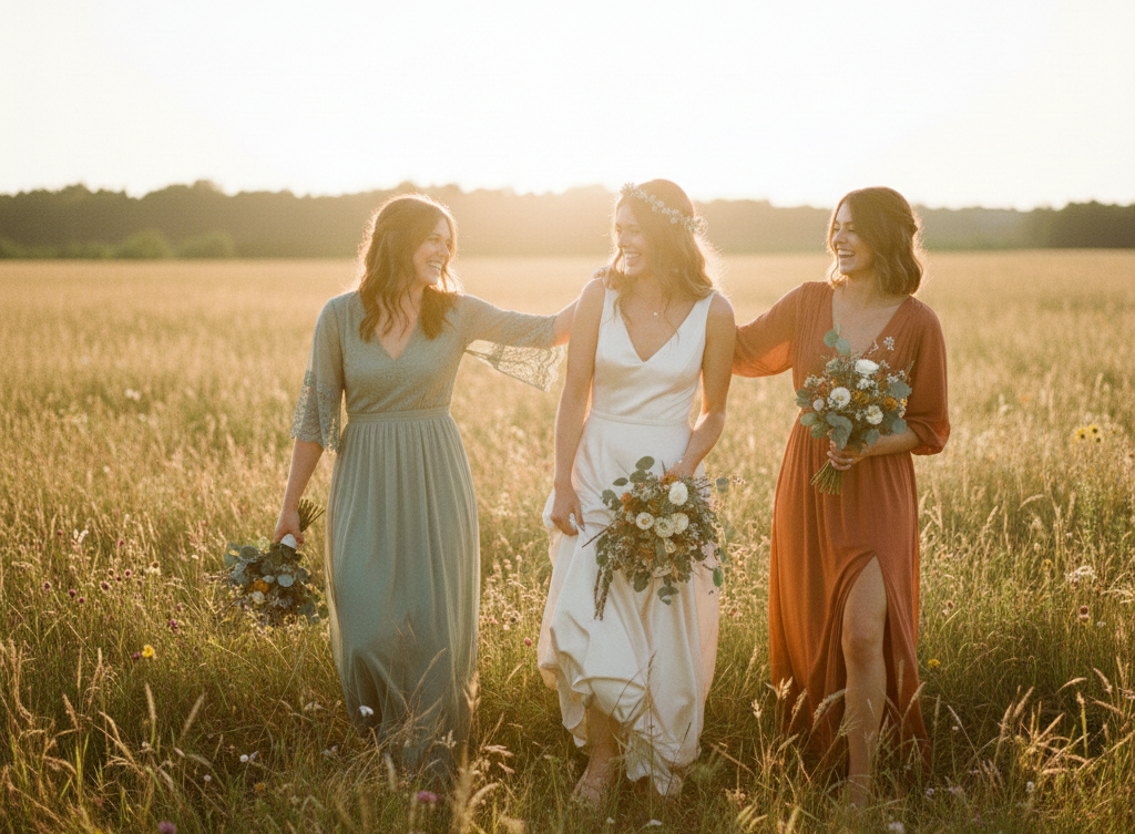 Coordinating the bridal party has become more flexible than ever. Instead of identical outfits, many couples now prefer mix-and-match styles where bridesmaids wear different silhouettes in the same color palette.